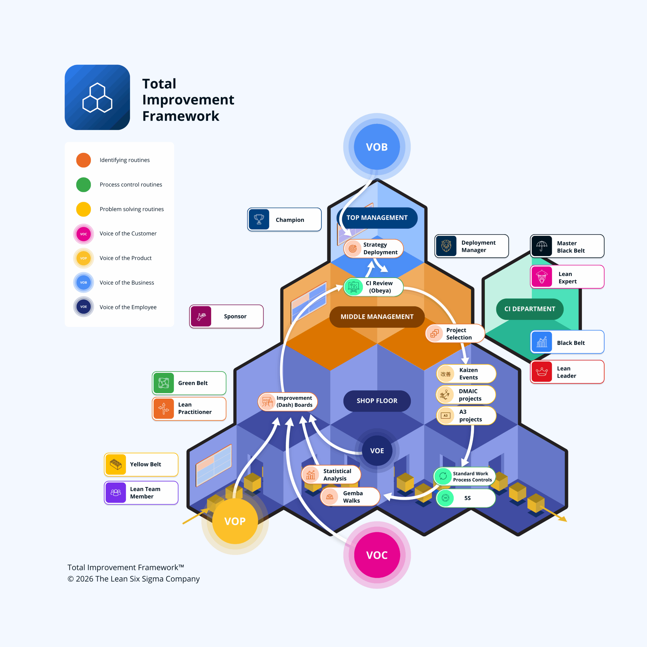 Le TIF repose sur un modèle qui associe rigueur et adaptabilité. Il s’ajuste à votre stratégie, à votre culture d’entreprise et à votre niveau de maturité, tout en assurant cohérence, répétabilité et résultats mesurables. Des rôles clairement définis, des routines partagées, un leadership engagé et des boucles de feedback continues permettent au Lean Six Sigma de dépasser le cadre des projets pour devenir un mode de fonctionnement commun et durable.